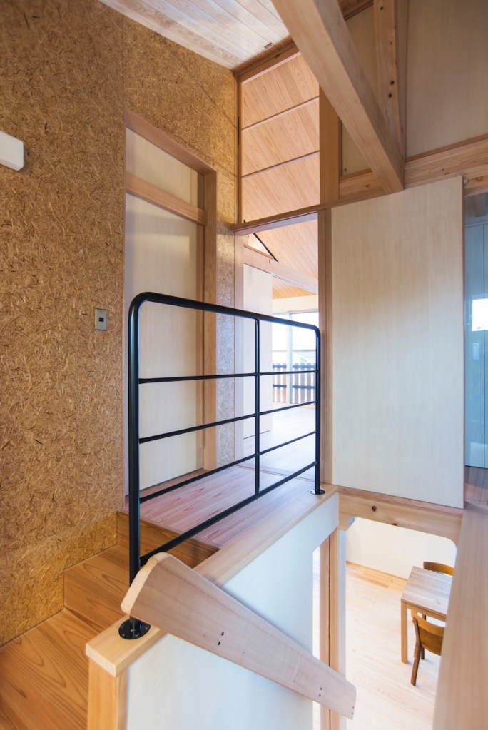 中央に据えられた階段を上ると、まず踊り場中2階に小さいけど充分な書斎とトイレを用意しました。2階まで一度に上がらずワンクッションあることで、上下階の移動もゆったりと感じられます。