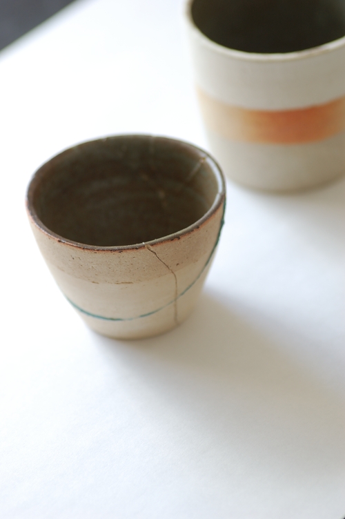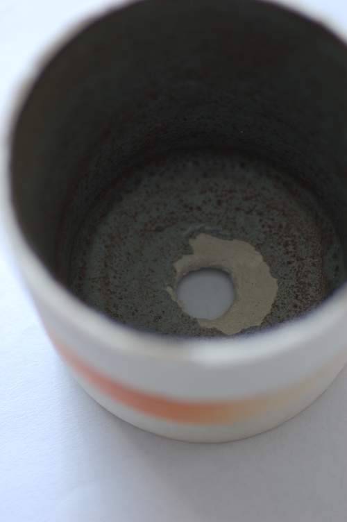 自分は今回は落として割れてしまった御猪口を瞬間接着剤で張り付けたものと、趣味の陶芸にて制作時に側面にヒビが入り器としては使用しづらいものを使いました。唯一、難しそうなのは底に穴をあける行程ですが、最悪は割れてしまっても接着剤でつければいいやくらいのつもりで(笑)トンカチの角でユックリとトントンすこしづつ叩いていくと徐々に欠けていきます。水抜きの穴なのでサイズも適当な大きさ(敷きこむ小石が落ちない程度)で問題ありません。