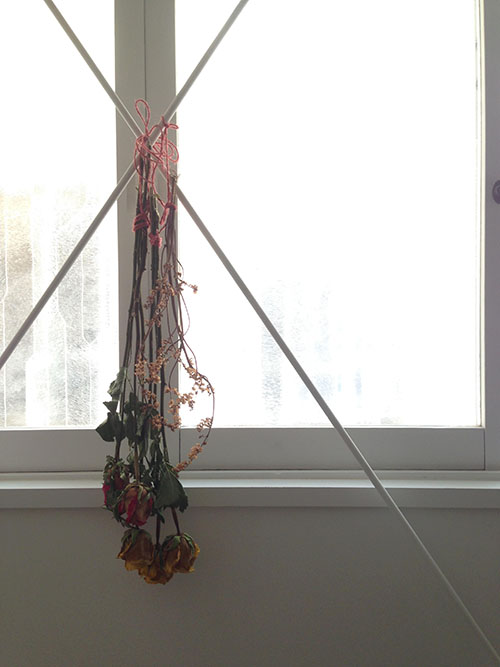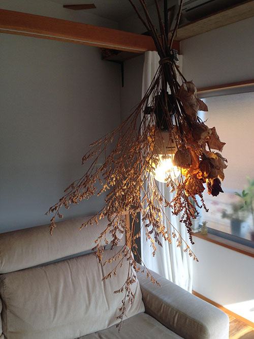 乾燥しきった後には、水が必要ない分、生花の時より飾る方法に自由がきき、単純に花瓶に挿しておくのも良し、吊るしたままでも、無造作に棚に置いてても様になります。