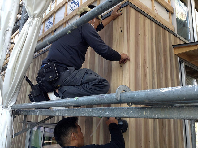 ある程度内部の工事に目処が立ったところで、大工さん達は外壁側に移り杉板張り工事が進められはじめました。