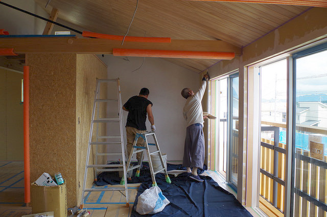 左官工事が始まりました。試験的な意味合いも含め蓄熱左官材を設計指定させていただきました。左官屋さんは今回初めて扱うため、材料の乾きの速さに塗り方や塗り進め方を試行錯誤しつつ、打ち合わせしながらの作業となりました。