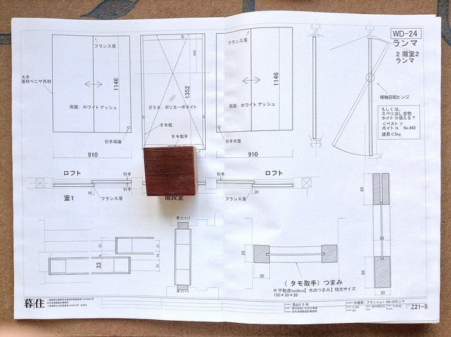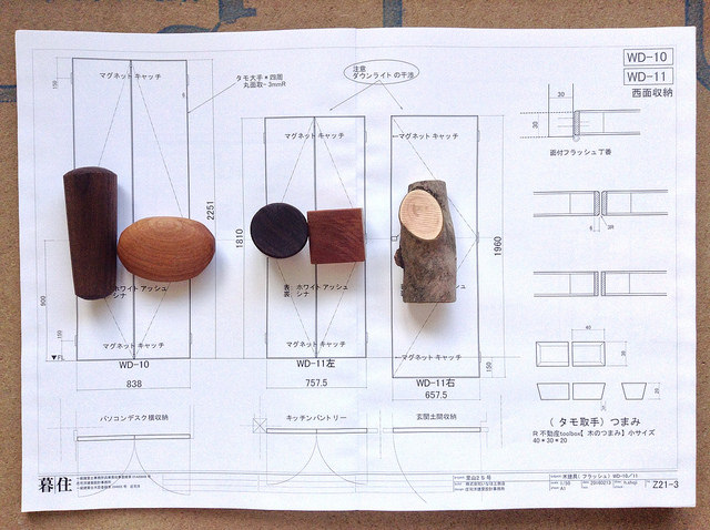 ポチテックさんのブログのなかで、木端(こっぱ)を使った素敵な帯留めが紹介されていました。かわいらしいだけでなく囚われない自由さが良いと思いました。扉や障子の取っ手は左右や裏表に同じものが付いている印象が多いと思います。そんな決まりのようなイメージも外してとにかく好きにしてください。とお願いしたものが、手元に届いたときは本当にワクワクしました。