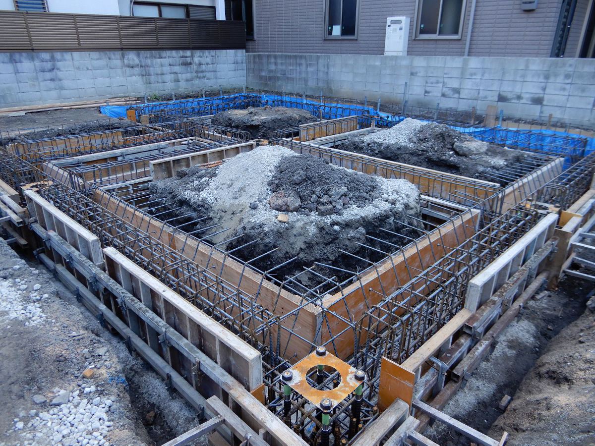 地鎮祭後、地盤改良(柱状改良)、掘り方、墨出しと進んで配筋検査を行いました。