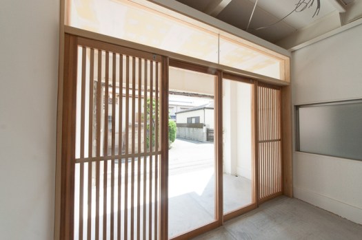 入り口は少し引いての引き戸。和のイメージも、という要望からの縦格子の意匠です。