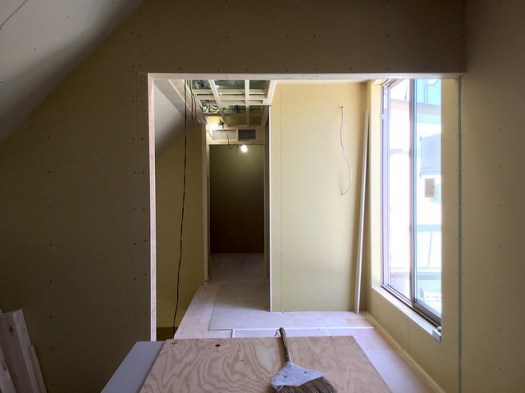 外壁の仕上がりまでもうひと息、内部の様子もどことなく掴めるような具合になってきたところ。今日は、施主様に脚を運んでもらい、現場での打合せでした。シンプルな仕上げな住まいなので、決めごとはどちらか言えば少ないのですが、少ないだけにひとつひとつに慎重になります。