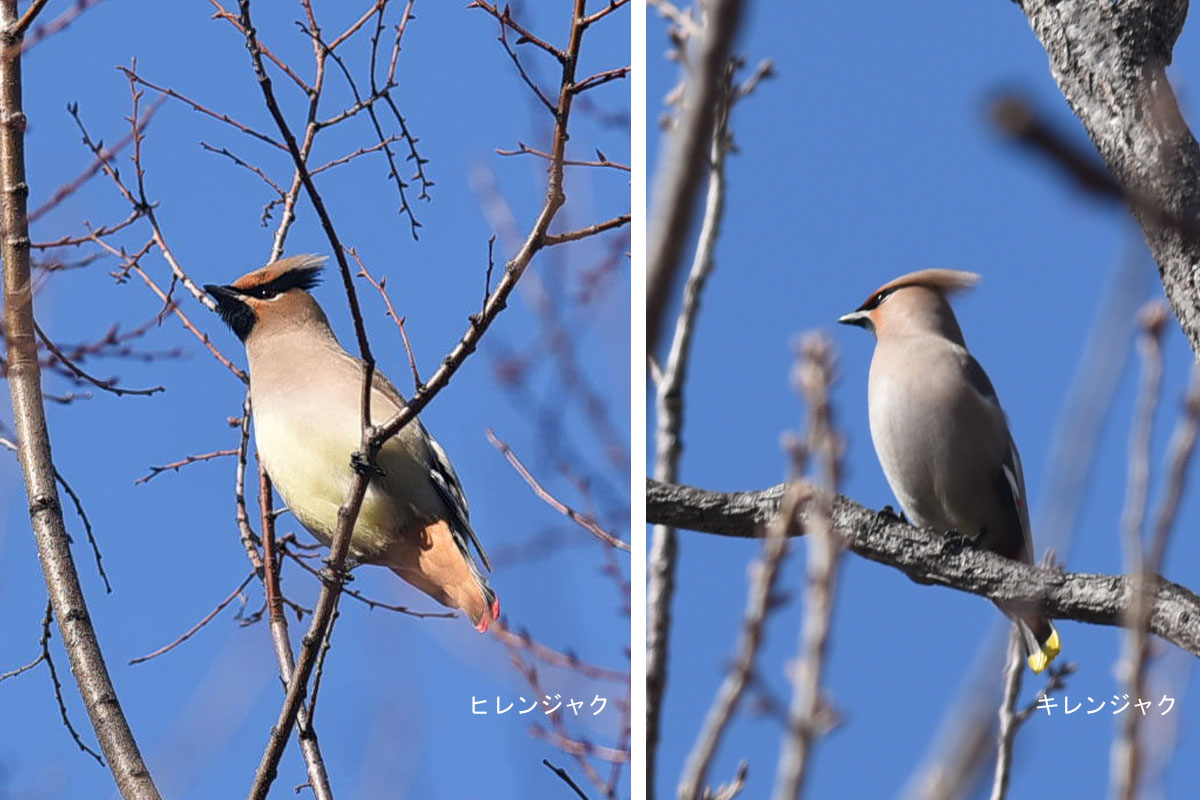 群れ(十羽程から多い場合数百羽)をなしている事が多く、”ヒィー・・ヒィー”と少し物悲しい鳴き声が 聴こえたら高木の上の方や電線を捜してみてください。個々の鳴き声は決して大きくないのですが群れで鳴くので結構賑やかです。さて、レンジャクと括りましたがヒレンジャク(画像左。簡単に言うと尾羽の先が 赤い”緋(ヒ)”)とキレンジャク(画像右。尾羽の先が黄色い”と黄(キ)”)の2種がおり、西日本はヒレンジャクが多く東日本はキレンジャクが多いと言われています。この2種がどう言う関係性を持っているのかわかりませんが確かに私の観察でもヒレンジャクの群れの中に偶にしれっとキレンジャクが数羽混ざっている事があると言う感じです 。もしレンジャクの群れと巡り会えたらじっくり尾羽の先を観察してみてください。