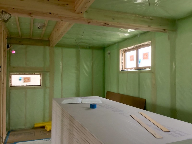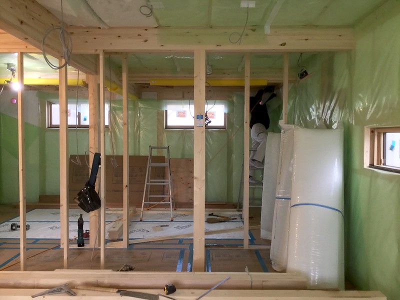 さてさて、そんなフローリングも数日後には貼られ、養生で覆い隠されてしまいました。今は、仕上がり具合を楽しみにする、嫌味な設計士かもしれません。