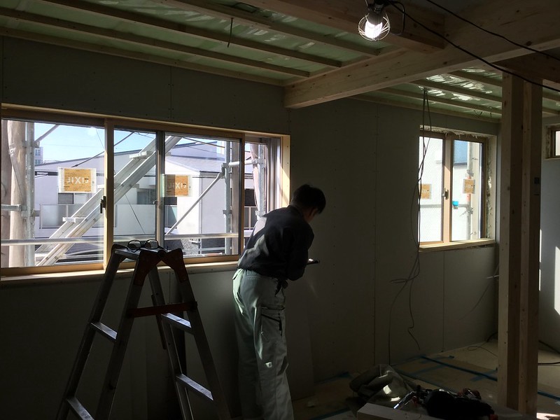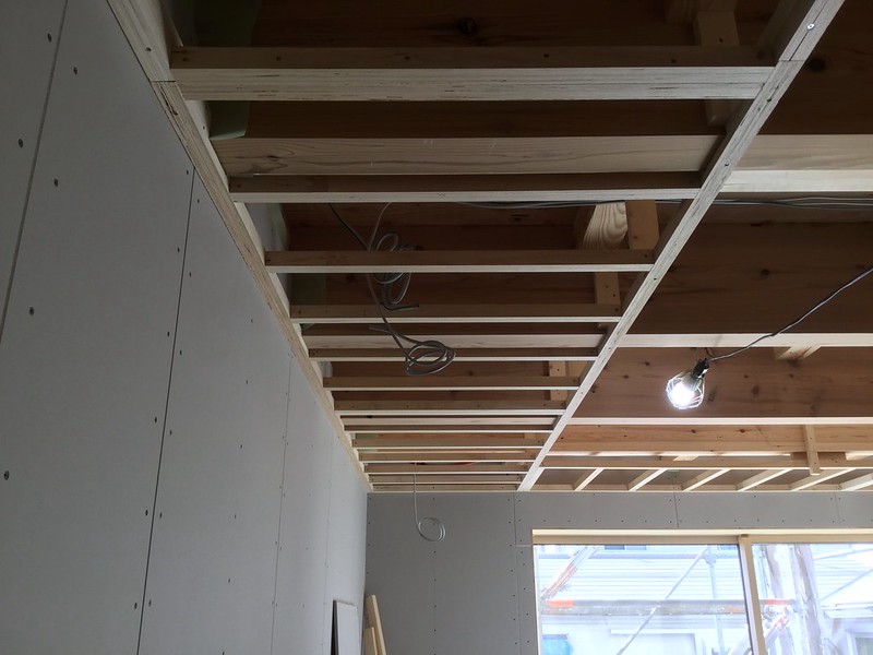 内壁のボードが貼られ天井下地が組みはじめられると、設計の時に描いていた内部のボリューム感をようやく掴み始められます。間仕切りも骨組みだけだった空間が壁になり仕切られるにつれ、部屋の広さが実感できるようになります。