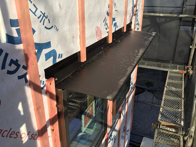 気がつけば、内部はすっかり気密シートで覆われています。外部も防水シートで覆われ、庇も付いていました。電気屋さん …