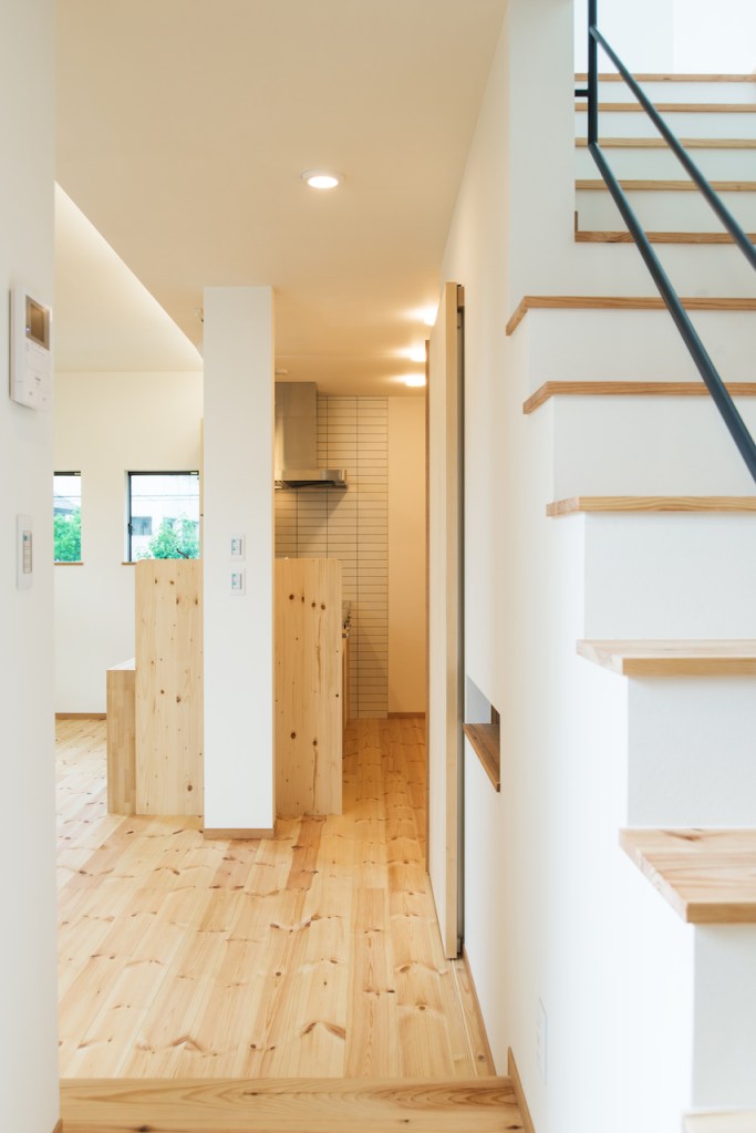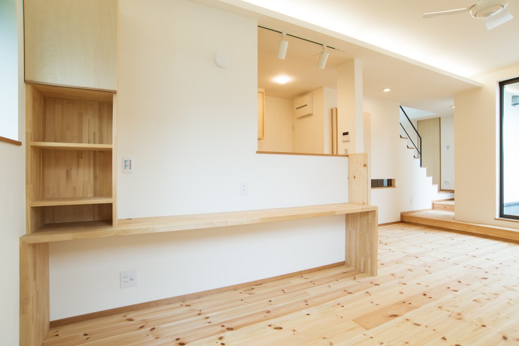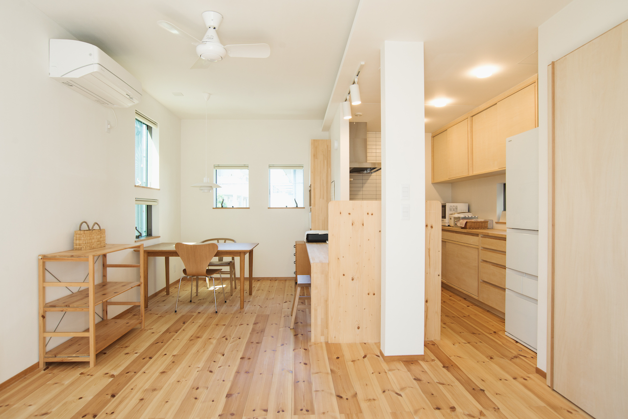 室内は、パインのフローリング、漆喰風塗装の壁でまとめ、暖かみのある落ち着いたインテリアになっています。
