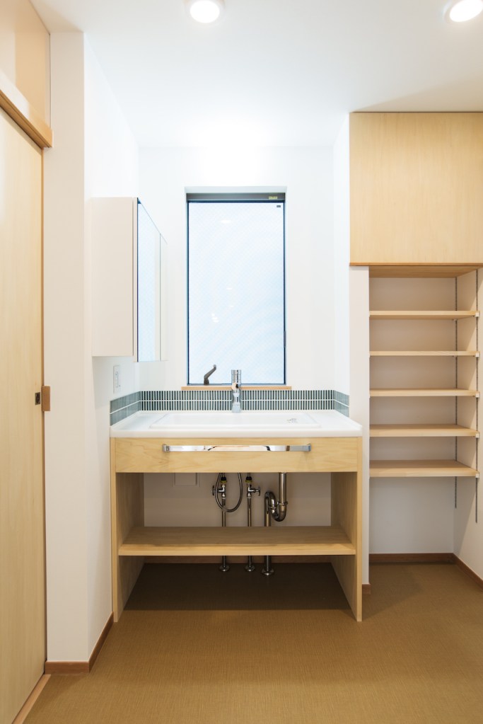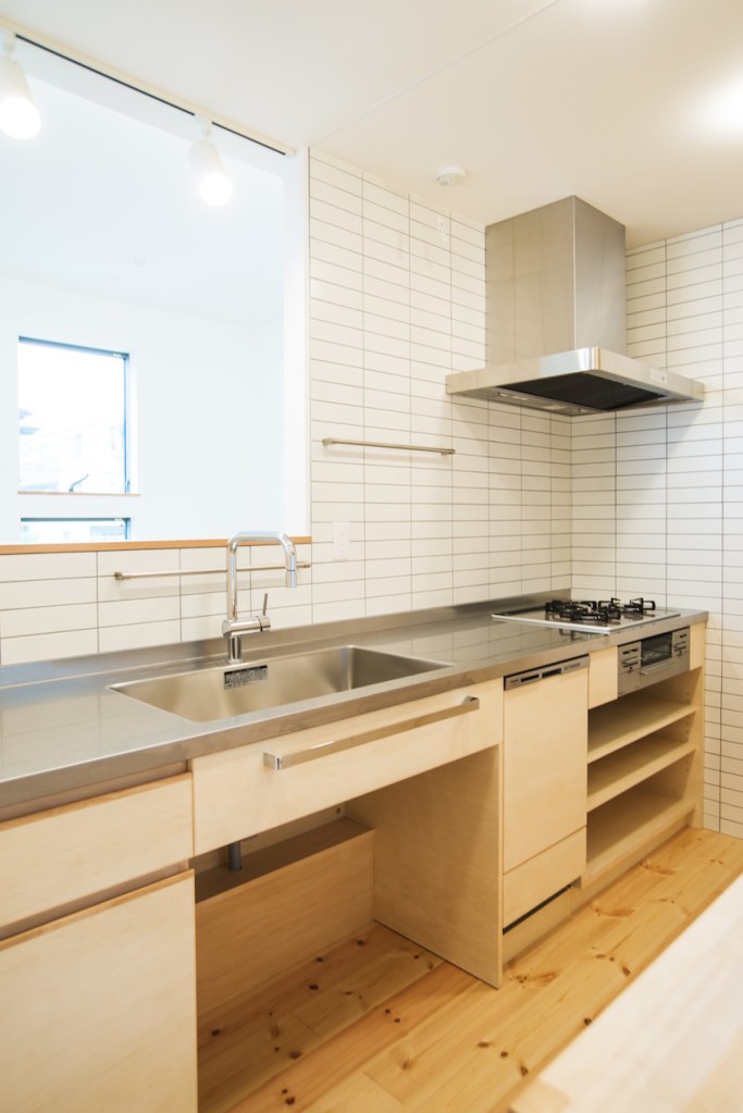 キッチンを含む水廻りのタイルは目地色もひとつひとつ打合せをしながら決めました。床はビニール床シート。