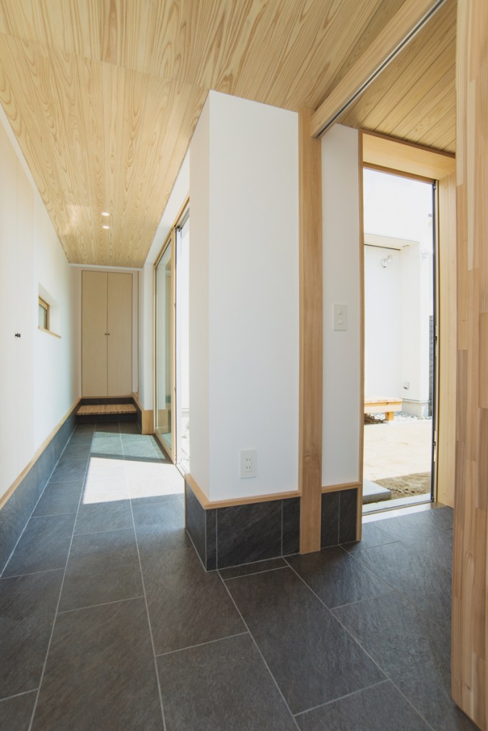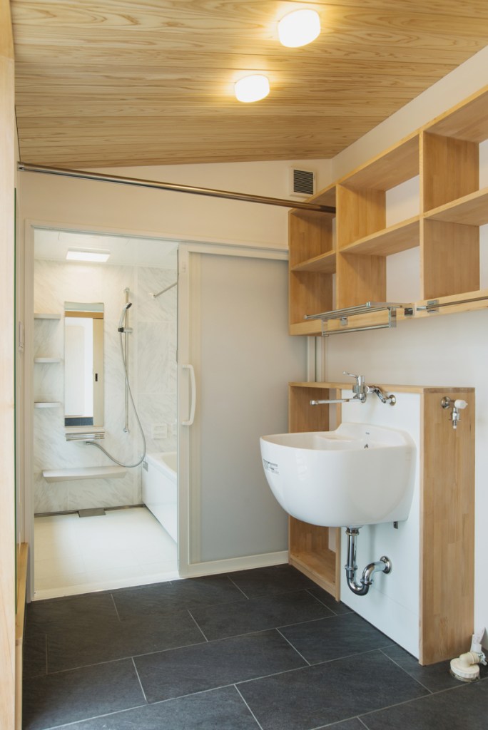 南側の平屋棟は、玄関に加え浴室と脱衣室だけがあります。中庭を挟み主屋に向かって開放しています。プライベート感満載。渡り廊下を過ぎると北側の主屋へくぐるように入ります。1階はLDKにトイレ。2階は、家族の個室にトイレと広めの洗面スペースを設けています。