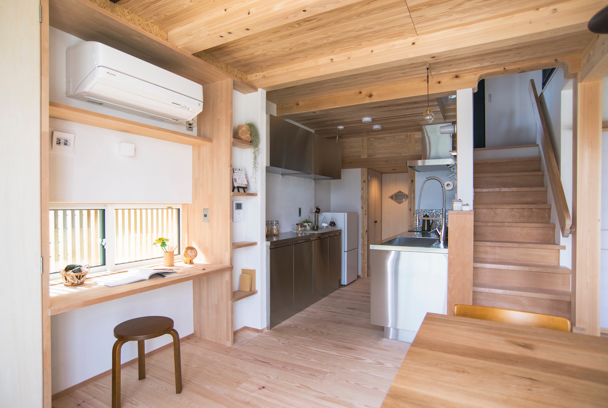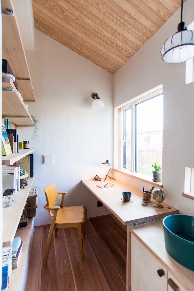 中央に据えられた階段を上ると、まず踊り場中2階に小さいけど充分な書斎とトイレを用意しました。2階まで一度に上がらずワンクッションあることで、上下階の移動もゆったりと感じられます。