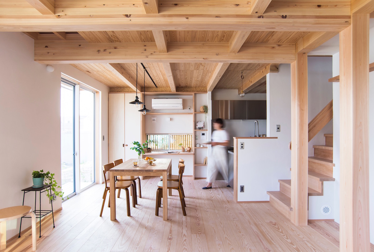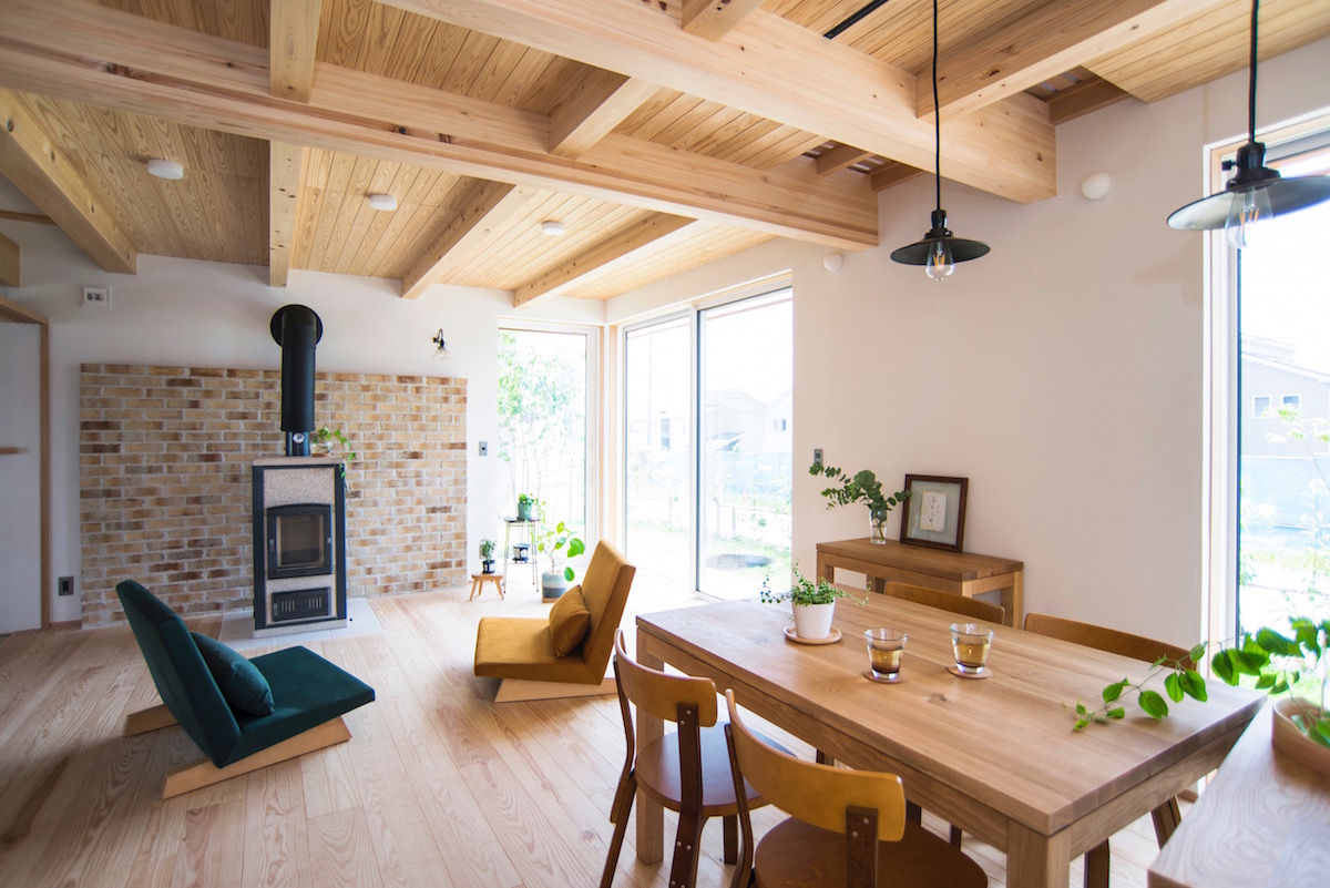 和室に続くリビングは南と東の庭へ大きく開放しています。そのまま西へダイニング、キッチンと続き、さらに玄関土間へとつながります。ぐるりと一周回遊できるようなプランとすることで、空気は淀み無く流れていきます。夏は庭との一体感を楽しみ、冬は薪ストーブの火にゆったりとした時間の流れを感じてください。